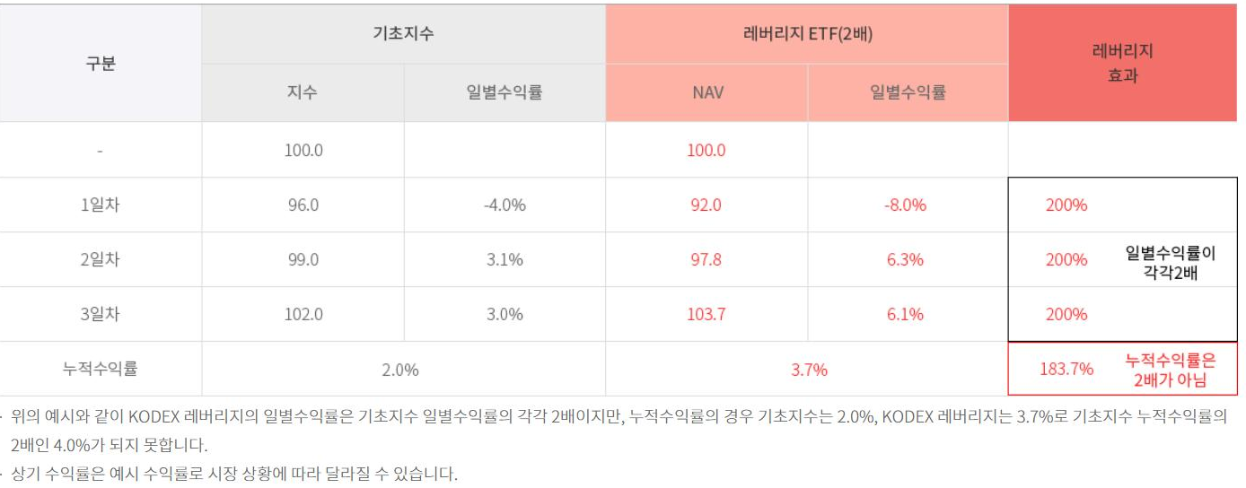 레버리지 상품은 '일별 수익률'을 2배수로 추적합니다. 그렇기때문에 시간이 지날수록 누적되는 수익률은 2배가 아닐 수 있습니다.