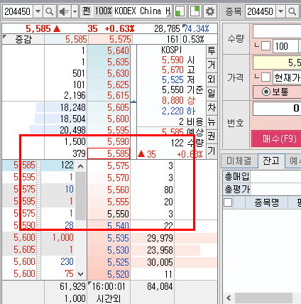 하지만 다른 ETF들의 경우 기준 가격보다 5호가 정도 위아래쪽로 LP들이 물량을 공급합니다. 한마디로 호가에 "공백" 구간이 생기는데, 이 안에서 개인들보고 알아서 매매를 하게 놔둡니다.